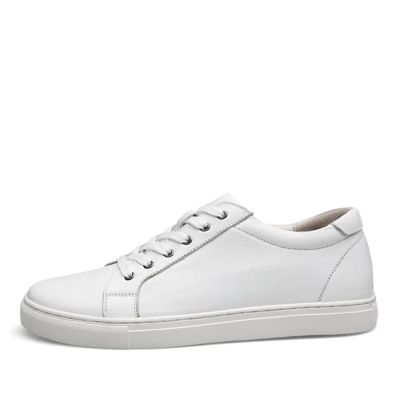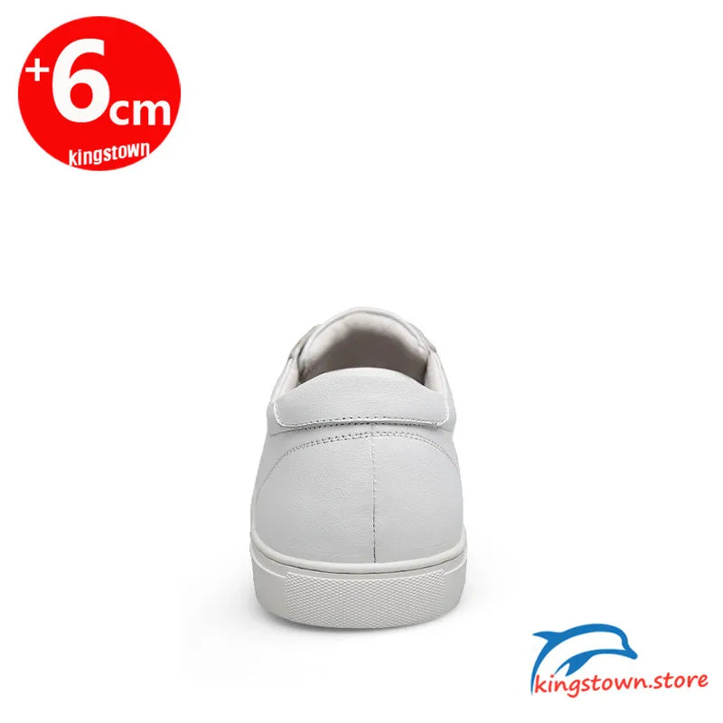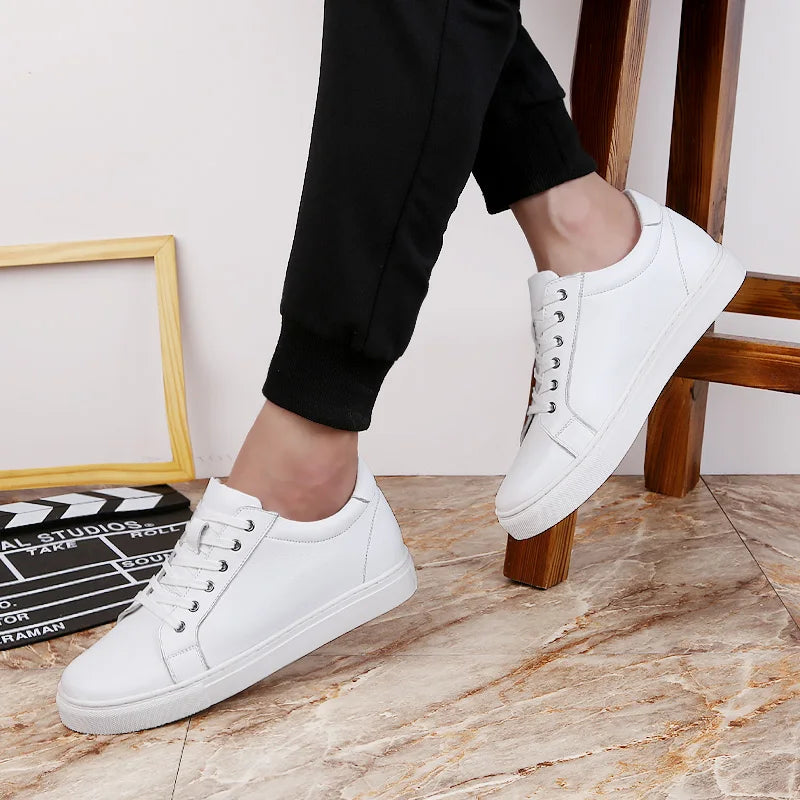 Step up your style and confidence with these sleek white elevator sneakers, designed to discreetly increase your height by 6CM while maintaining a natural look. Crafted from premium leather, these sneakers offer a refined and modern aesthetic, making them perfect for casual outings, business casual settings, or everyday wear. The clean, minimalist design ensures versatility, effortlessly complementing various outfits for a polished appearance.